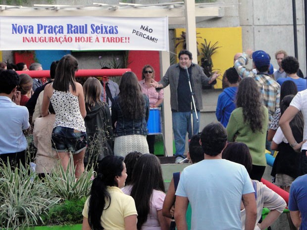 Mocotó explica a situação para o público na praça (Foto: Malhação / TV Globo)
